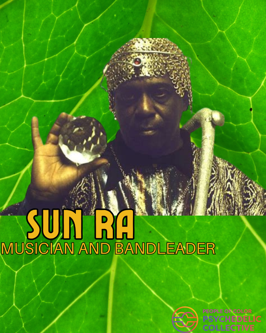 Sun Ra was a composer, jazz big band leader, piano and synthesizer virtuoso, and a particularly unusual being. Born in 1914 in Birmingham, Alabama, Sun Ra was a musical prodigy who migrated to Chicago in the mid-40s, where he founded his ensemble called the Arkestra. Sun Ra famously forbade his band members from using drugs or alcohol and told his audiences that he alone was all the drug that they would ever need. He promoted his large, disorientingly flamboyant stage shows as a platform for human development and happiness. His emphasis on building a cosmo jazz odyssey of African dance and percussion, free jazz, and performed mythology offered an early form of AfroFuturism long before that term had been invented. Sun Ra was able to fluidly navigate time and space in a way that strongly suggested an altered form of consciousness, and he performed this feat without ingesting psychoactive substances. Sun Ra's legacy is a path of non-violence, freedom, creativity, and healing. He left the planet in 1993.
