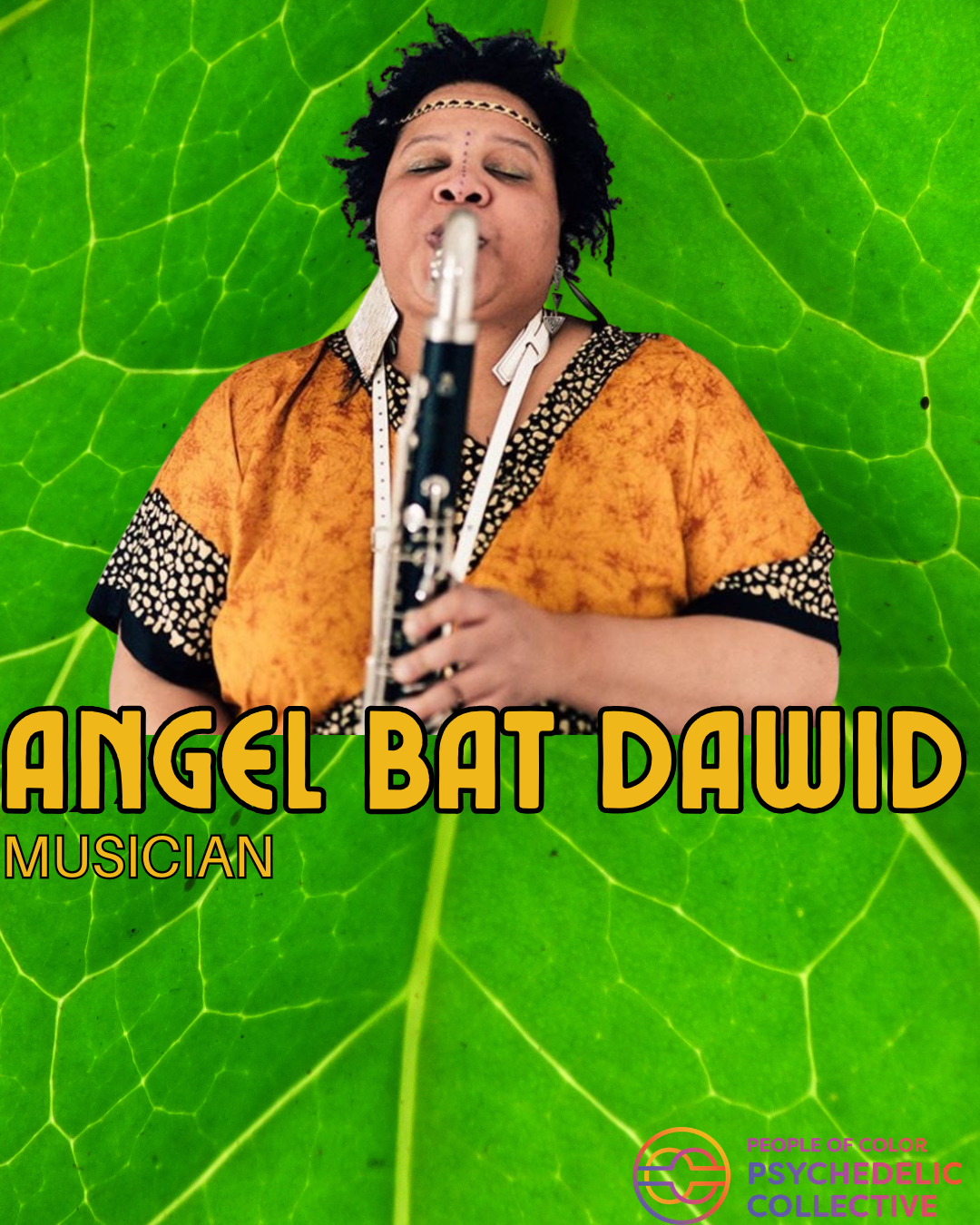 Angel Bat Dawid is a jazz composer and masterful clarinetist. She also sings and plays piano. She was born in Atlanta in 1979 and spent part of her childhood in Kenya before moving to Chicago, where she immersed herself in a rich African American musical culture. Greatly influenced by Sun Ra, her anti-racist music can paint a cinematic reimagining of Black pasts and Black futures. . Her performances are spiritual, fluid, and interactive. After seeing Bat Dawid at the 2022 PDX Jazz Festival, Collective member Lorena Nascimento said, “It feels like a psychedelic church ceremony.” Similar to Sun Ra, Angel does not provide a direct connection to psychedelic advocacy, but her music and performances strongly evoke experiences beyond normality, that is, cognitive and ontological resistance. Angel is also an educator, teaching music to youth. Her last, Journey to Nabta Playa, a reference to an archaeological site in the Nubian Desert of southern Egypt, references cosmic travel, the processing of grief, and the Black church.